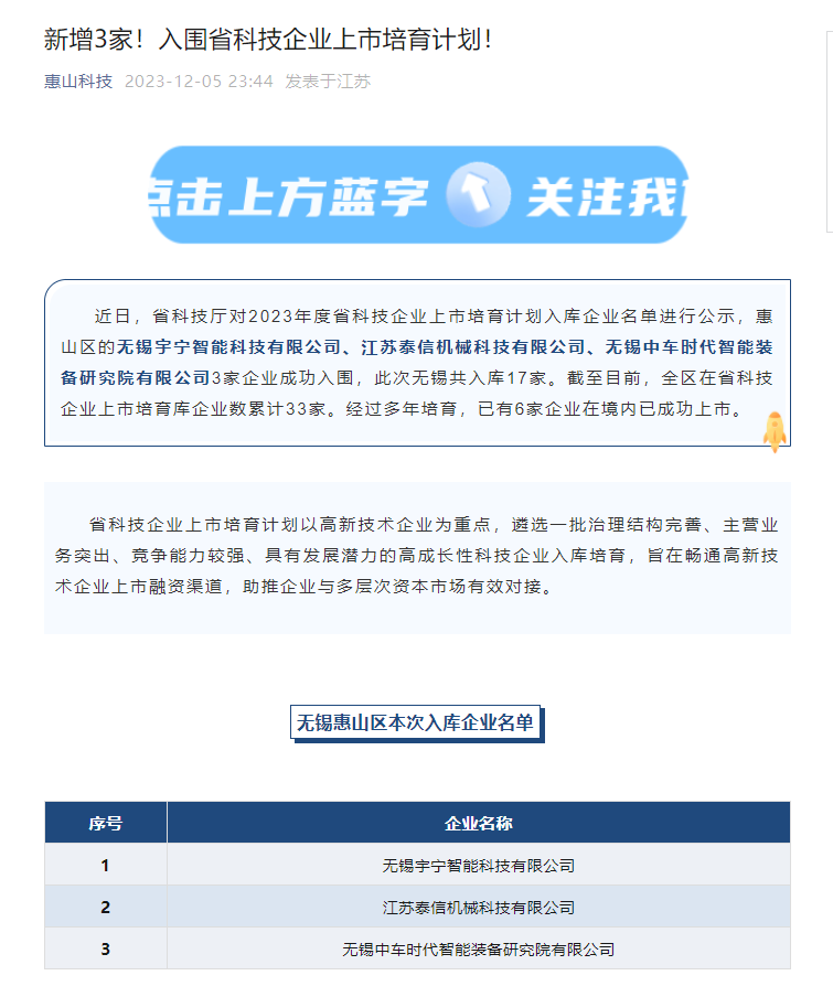 泰信機(jī)械被省科技廳評(píng)為上市培育企業(yè)